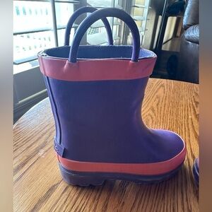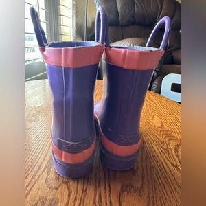 These stylish rain and snow boots feature a vibrant purple and pink color scheme, perfect for adding a pop of color to dreary weather. Crafted from durable waterproof material, they ensure your feet stay dry and comfortable. The classic silhouette with a rounded toe offers both practicality and flair for any rainy or snowy day. The boots have no tears or rips. They come from a pet and smoke free home. They have been well loved but still have lots of life left.