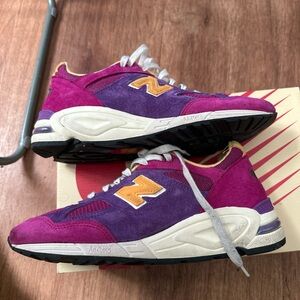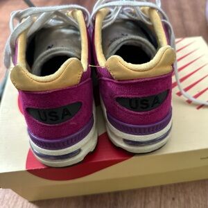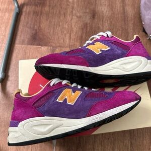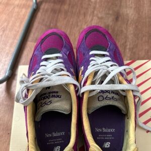 Stylish sneakers featuring a vibrant purple and pink design with yellow accents. Perfect for adding a pop of color to any outfit.
