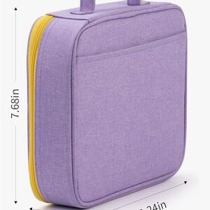 Stylish purple travel organizer with yellow accents. Features multiple compartments and a secure zipper closure. Ideal for pens and small accessories.
