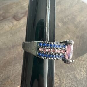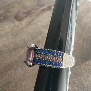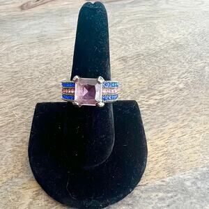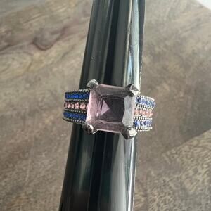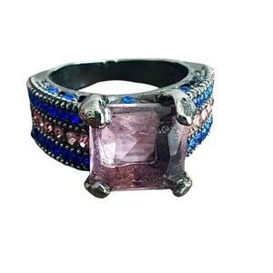 Purple and blue rhinestone studded princess cut chunky cocktail ring - size 8.5