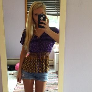 Tie neck, short sleeved with an elastic waist. Never worn out before for some reason, but super adorable and soft!