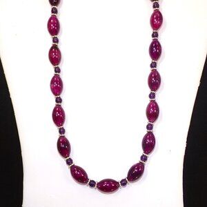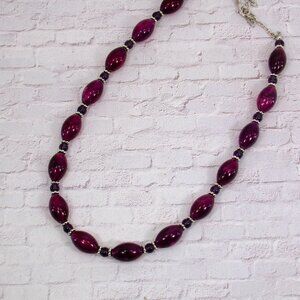 Purple beaded fashion necklace. It is designed with a mix of tube-shaped acrylic beads and round glass beads in a rich, deep purple hue. Each bead is separated by small silver spacer beads. This eye-catching piece blends elegance and versatility, making it the perfect accessory for any occasion—whether you're dressing up for an evening out or adding a pop of color to your everyday style. New and never worn.