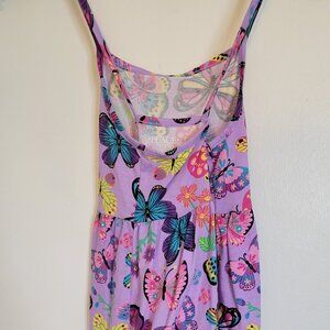 Spaghetti-strapped purple dress with butterflies on it. Straps crisscross in the back. Size 10/12. Fun summer dress.