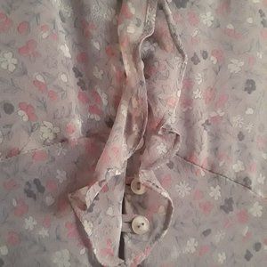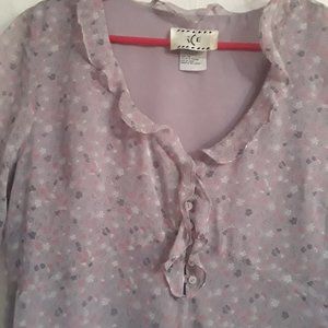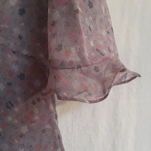ICE Light lavender purple calico print semi sheer chiffon dress with a ruffle around the neck and a little way down the front with the buttons. Size 12. Label is ICE. It is lightweight, semi-sheer polyester and is lined. It has an empire waist and the sleeves are 3/4 length with a little ruffle.