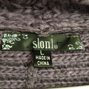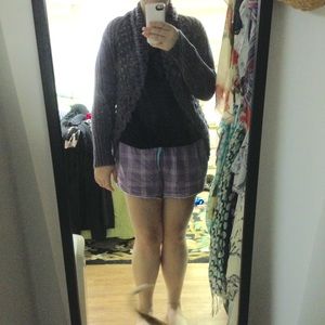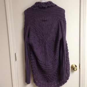 Purple circle wrap sweater long sleeve size L, but worn when I was a 1X as a layering piece. Super cute as a layering piece with jeans and a tank. Purchased from Versona.