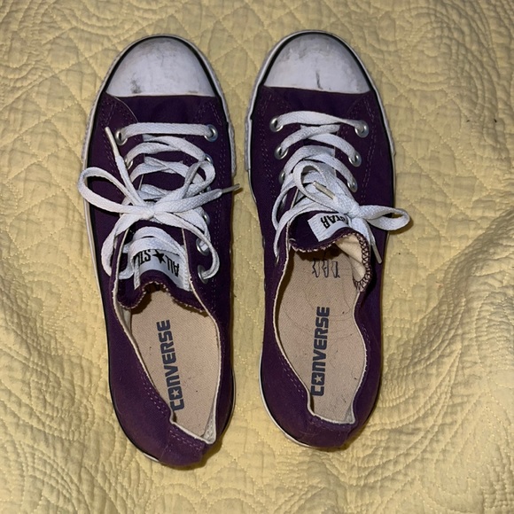 Purple converse Chuck Taylor’s size 8. Worn a few times but still have a lot of life in them. The tips are scuffed but could be cleaned, they’ve been in a bin with other rubber soled shoes so that’s what it’s from. I can count on 1 hand how many times these have actually be worn.