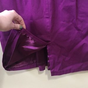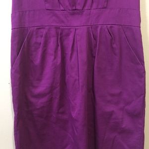 Really cute purple dress with tulip skirt, rounded neckline, tank sleeves and pleating at waist. Pockets hidden in pleats at waist! Really cute-can be dressed up or down and has a full satin lining so it feels good on as well. Bought optimistically but I haven't lost as much weight as I thought I would. Tried on approx. 3 times but never worn.