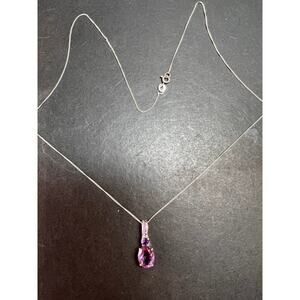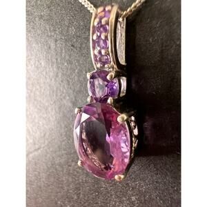 Main larger stone seems to be a treated fluorite. Middle stone tests as amethyst. Small accent stones might be fluorite also. Or maybe something completely different like spinel , or zircon but none whatsoever are glass or CZ. Prong set in authentic 925 sterling silver. STS on back of pendant for Chuck Clemency. Chain is also sterling silver measuring 20 inches.