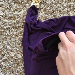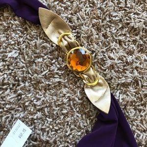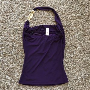 Brand new with tag. Never worn. This beautiful purple halter top is a size Small, has a nice piece on the strap with orange crystal and gold plate.