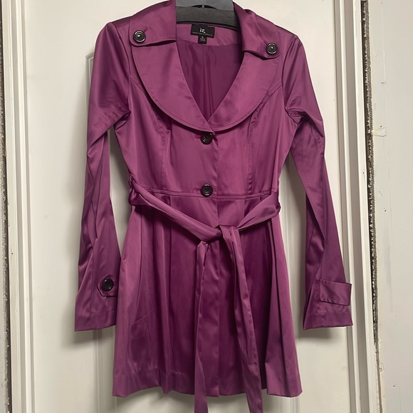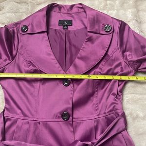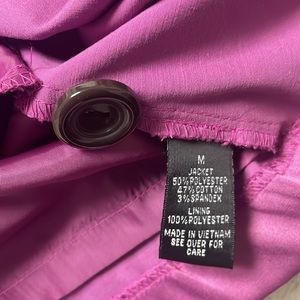 Waist tie. Pleated fuller bottom. 3 brown button front closure. Side slit pockets. Satiny type look. Hits about mid thigh