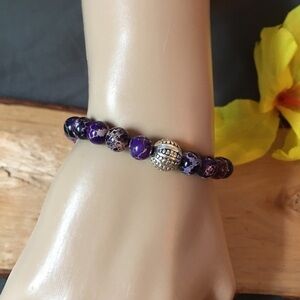 Purple jasper stretch beaded bracelet with large silver accent bead.