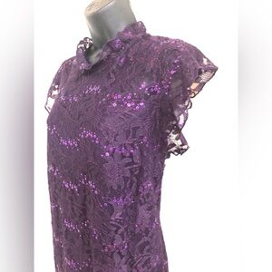 Purple lace sequin ruffle neck flutter sleeve sheath plus cocktail dress size 16