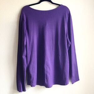 Great condition purple shirt with whimsical black cat on a fence with bats and huge full moon. “Trick or treat” graphic, gold font and bats sparkle in the light. Printed tag no brand 3X (22w/24w).