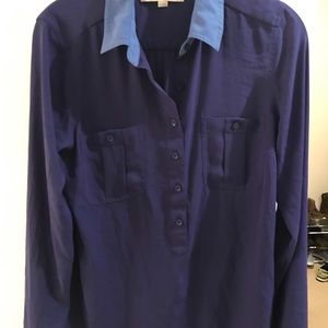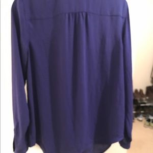Bright purple long sleeved button up with blue accent color. Silky material and great for work!