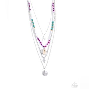 A collection of various silver chains, one infused with a collection of multicolored seed beads cascades in whimsical layers along the neckline. The uppermost chain features a dainty silver starfish charm, the seed-beaded strand features a white conch shell set against a silvery backdrop, and a shimmery seashell dangles from the chain below the colored strand. Featuring a dainty white pearl that rests against a coastal-inspired backdrop, a flat silver pendant glides from the lowermost chain for a summery finish. Features an adjustable clasp closure.