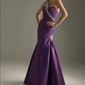 This is a purple trumpet gown with silver beaded trim. It's only a few years old and was only worn once. This gown is in fantastic condition!