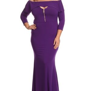 Solid off the shoulder, bodycon fit, 3/4 length sleeves, zippered front bodice and cut out detail long dress. This sexy dress makes a statement at any event. In Purple or Black
