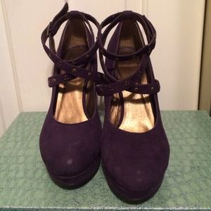 Shoedazzle purple faux suede platform heels. Ankle straps go through 2 loops on back. Straps have 3 different types of studs. Only worn once and show some signs of wear but in good condition. I love them but they are a little too big on me :( put a cushioned insert in the front of each but couldn't make them work :(