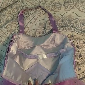 I wore this dress once for a couple hours at my sweet 16. Light purple color with gems on the top and a halter neck. Back of the dress has a zipper and hook to keep the dress secure. Bottom comes to just above the knee. Skirt portion has slight poof