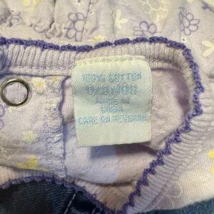 Purple romper with white, yellow and purple flowers