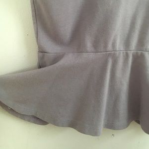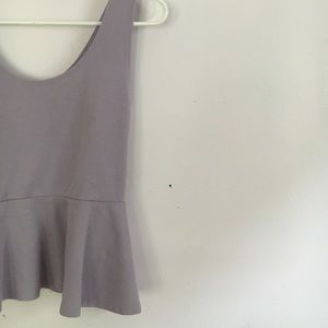 Pastel purple peplum top, scoop neck, hem falls at top of hip bone on 5'7 frame. Works with leggings, skinny jeans and high waisted shorts.