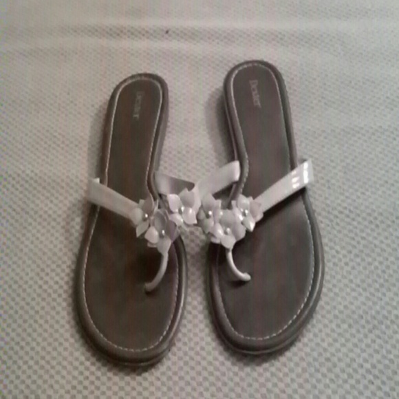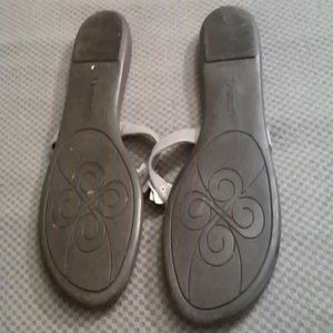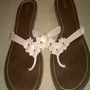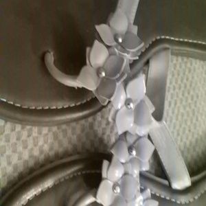 Handcrafted lavender petaled sandals with white stitching on the base.