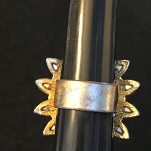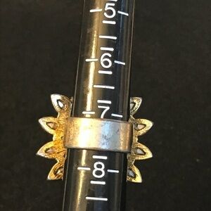 Fun costume ring! Center purple stone measures half an inch, surrounded by white and orange/yellow tear drop shaped stones. Gold background. Some signs of wear. Size 7.5.