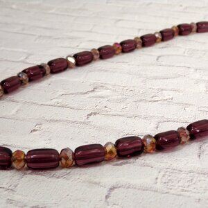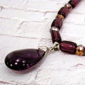 Purple teardrop glass pendant necklace with tube and rondelle shape glass beads.