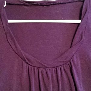 Mid length sleeves, detailed neckline, purple, a little pleat type stuff coming off top, bottom band