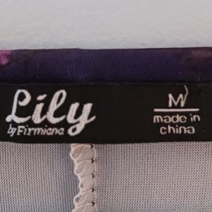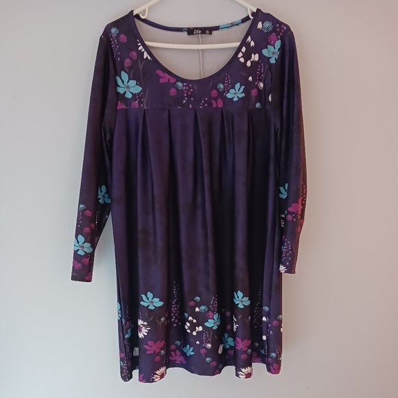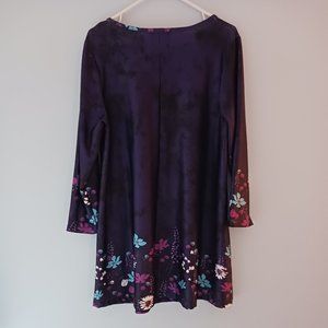 Cute long sleeve purple dress with floral detail around neck, ends of sleeves, and along bottom