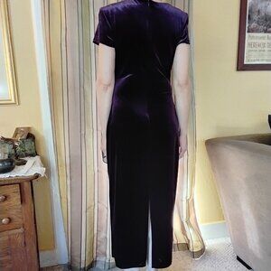 Short sleeve dress with attached scarf detail. Full length. Made of polyester and spandex. Simple, throw on elegance.