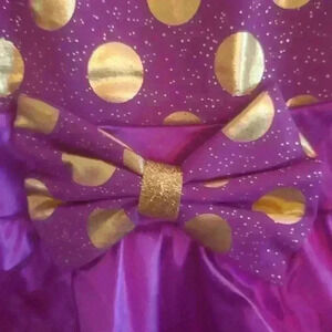 Pointed collar with back snaps and adjustable straps, waist bow, peplum with gold glitter trim and attached bike shorts.
