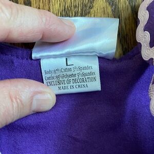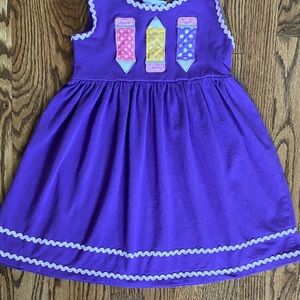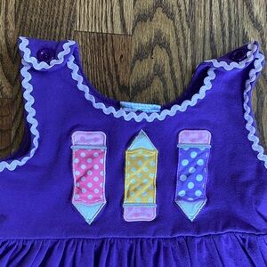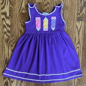 Adorable purple with 3 pencil appliqués Ruffle Girl dress, size Large (5). Excellent condition, no stains or rips. Dress is a true purple, photos make it look more blue-purple with pink scallop detail around the bottom and bodice. Stretchy, mid-weight fabric, button straps. Perfect for back to school!