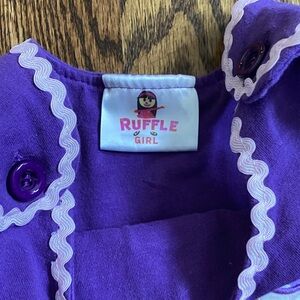 Purple with pencil appliqué Ruffle Girl dress, size large (5), excellent cond.