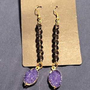 Embrace regal charm with these enchanting purple and gold beaded earrings, adorned with a captivating purple crushed glass pendant. The royal combination of deep purple and lustrous gold beads exudes a sense of opulence, while the pendant adds a touch of whimsical allure. Perfect for adding a dash of color to your ensemble, these earrings effortlessly fuse elegance and vibrancy, making them a versatile and stylish accessory for any occasion.