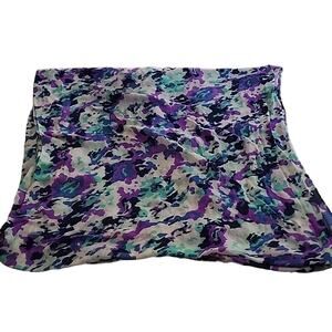 Lightweight scarf in purple/black/white/aqua color pattern.