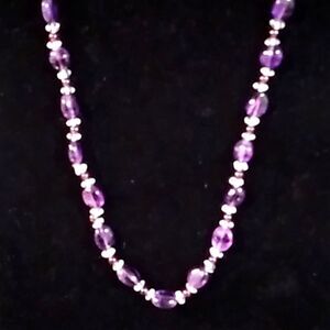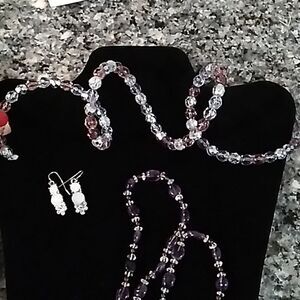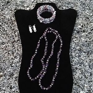 Bracelet is lighter purple/silver/clear plastic beads. Not glass like the Necklace. It is a wrap bracelet that looks very nice with the necklace.
