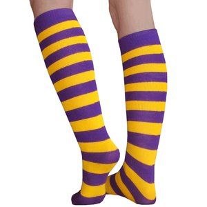 A pair of purple and gold striped knee-highs is the ideal choice for every fun-loving person looking to add some exciting colors to her wardrobe. Made in USA