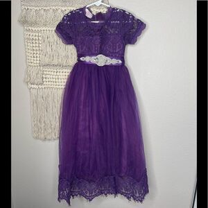 Purple lace flower girl dress size 4. I feel like it runs large and my daughter is pretty slender. She wore this at the age of 6. Removable rhinestone embellished waist tie. Hidden rear zip. Lined. Worn once washed and lined dress. Great condition.