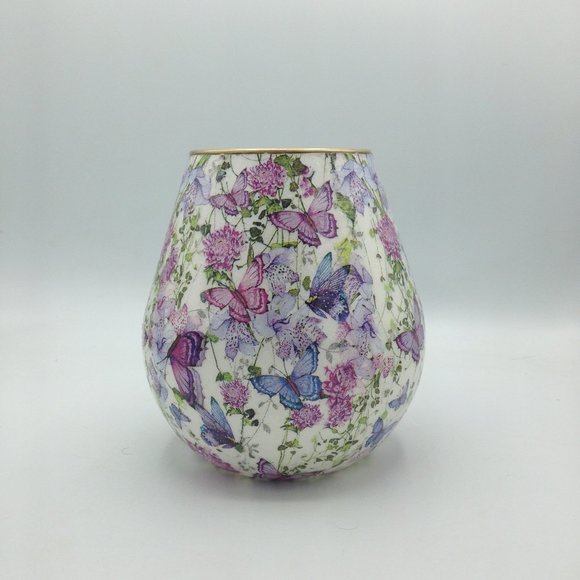 The pieces are decoupaged with a beautiful paper napkin featuring purple/lavender butterflies and florals on the outside. The pieces are first “sponged” with a special white metallic paint and then decoupaged. This process provides a deeper color for the butterfly pattern. When completed, the pieces are sprayed with clear acrylic which provides a superior finish that will last for years. The pieces are beautiful on their own or when used with a tea light or LED/Fairy String Lights. The pieces make great gifts for a birthday, Mother's Day, Christmas, anniversary, wedding or even for yourself.