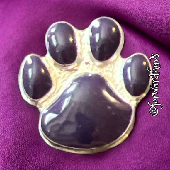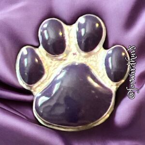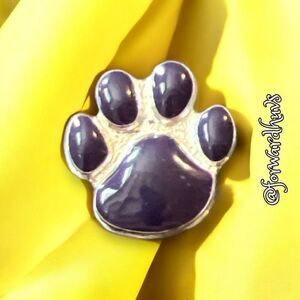 Calling all dog moms! Showcase your love for animals with this charming Silver Tone Enamel Paw Print Pin. Crafted with exquisite attention to detail, this pin features a delightful paw print design filled with vibrant purple enamel.