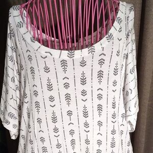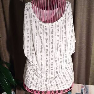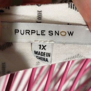 This Purple Snow white short sleeved tee is a size 1X with a pit to pit measuring 24". It is white with gray arrow designs on it. It ties in the bottom front. 95% rayon 5% spandex and machine washable. Pre-owned and in excellent condition. All offers welcome.