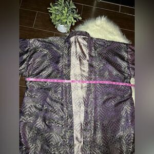 This beautiful kimono is handmade and features a collared neckline, 3/4 wide sleeves, and an open long length. The fabric is adorned with a stunning purple and gold design and also has two side pockets. Fits like a large/XL. It is sure to make a statement!
