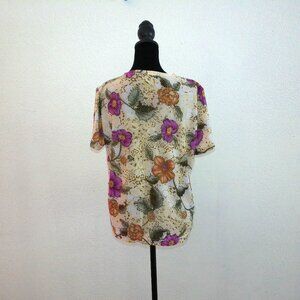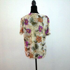 Purple/orange/beige shiny floral T-shirt, with golden glitters details