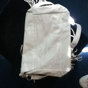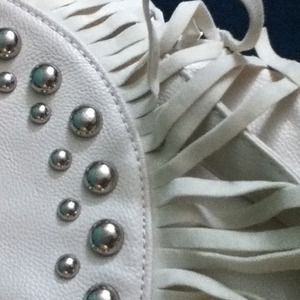 Cream colored studded frenged purse with a long strap very spacious and medium sized