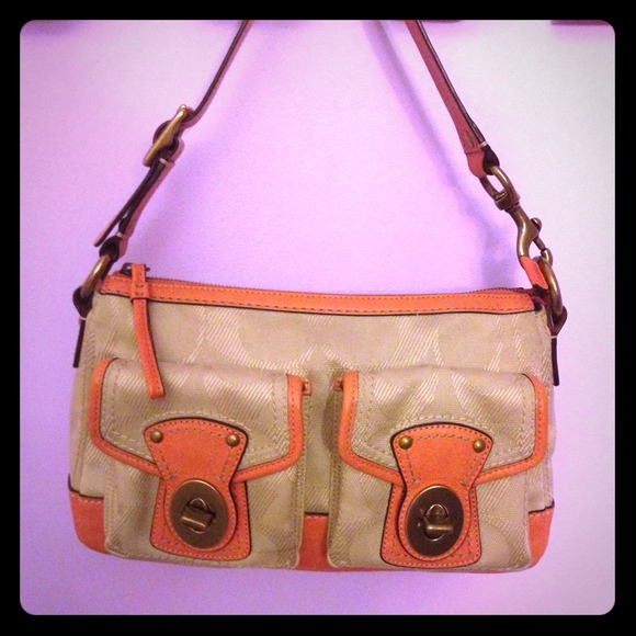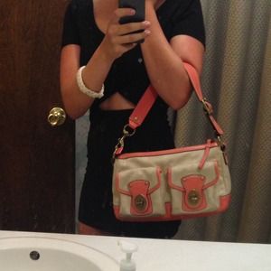 Coach handbag. Coral leather detailing. 2 buckle pockets on the front. Great condition! Only used once.
