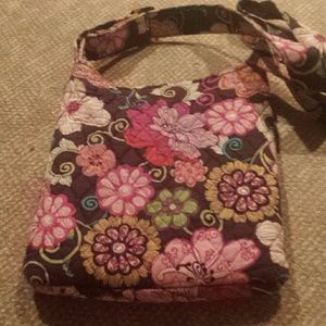 A beautiful purse with beautiful designs with 3 pockets and 2 pockets on the inside also has adjustable strap has a little fray on the side of the strap but other than that in good condition
