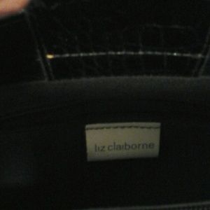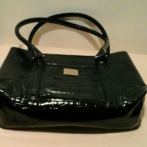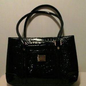 Black vinyl purse two interior pockets, zipper pouch in center. Cell phone holder. Gently used. Shows some light signs of wear on bottom.VGUC.