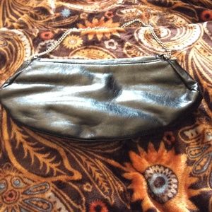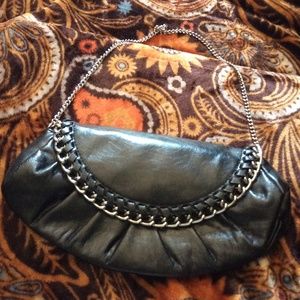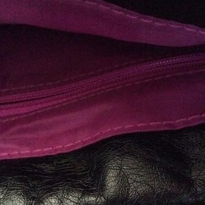 Black purse lined in the color fushia inside. Designed with silver chain and has a silver handle.