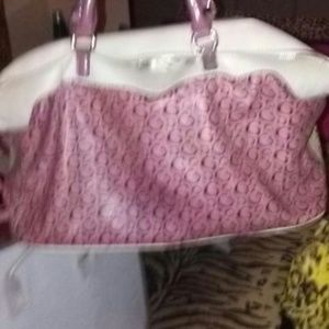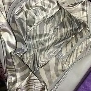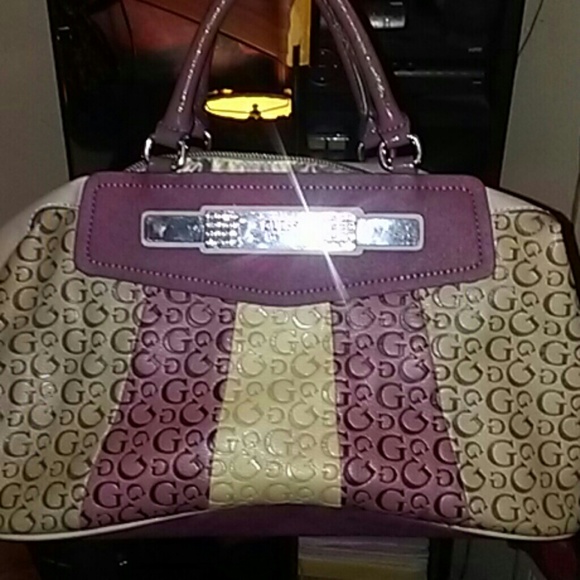 Guess Purse,plum and beige exterior with Guess emblem and gray n white satin zebra inside. Clean